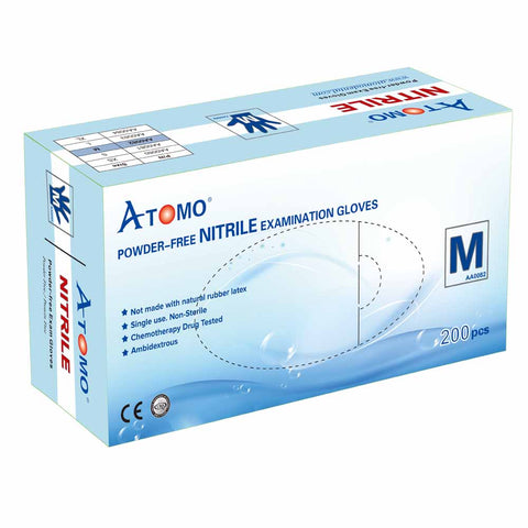ATOMO Dental comfortable, super-soft flexible Powder-Free Nitrile Exam Gloves provide added safety. Excellent flexibility to minimize stress and fatigue, allow full range of motion. Do not contain natural rubber latex. Length: 9.5".